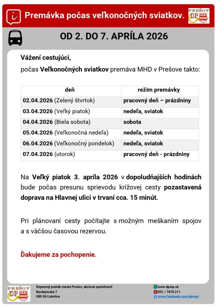 Na Veľký piatok 3. apríla 2026 budú linky MHD premávať ako v nedeľu. V dopoludňajších hodinách bude zároveň počas sprievodu Živej krížovej cesty pozastavená doprava na Hlavnej ulici približne na 15 minút. Pri plánovaní cesty preto DPMP odporúča cestujúcim počítať s možným meškaním spojov a s väčšou časovou rezervou.