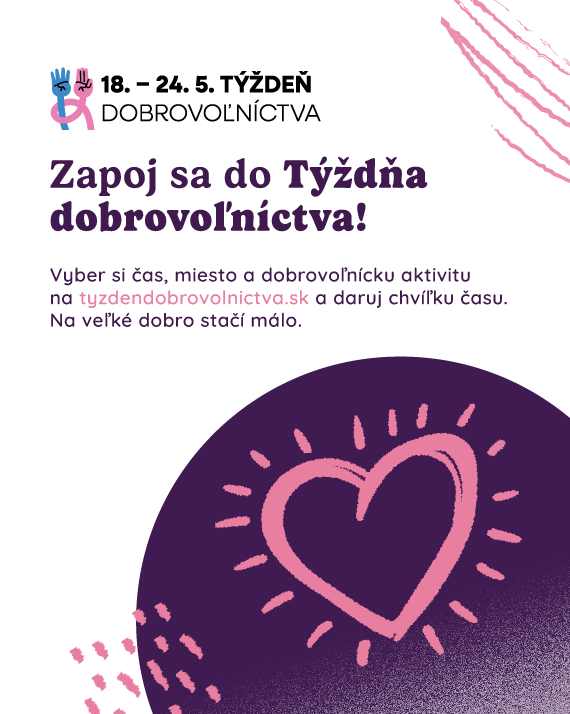 Týždeň dobrovoľníctva je celoslovenská kampaň, ktorá prepája ľudí ochotných pomôcť s organizáciami, školami, komunitami či samosprávami po celom Slovensku. Dobrovoľníctvo si počas nej môže vyskúšať naozaj každý, jednotlivec, partia kamarátov, školská trieda aj firemný tím.